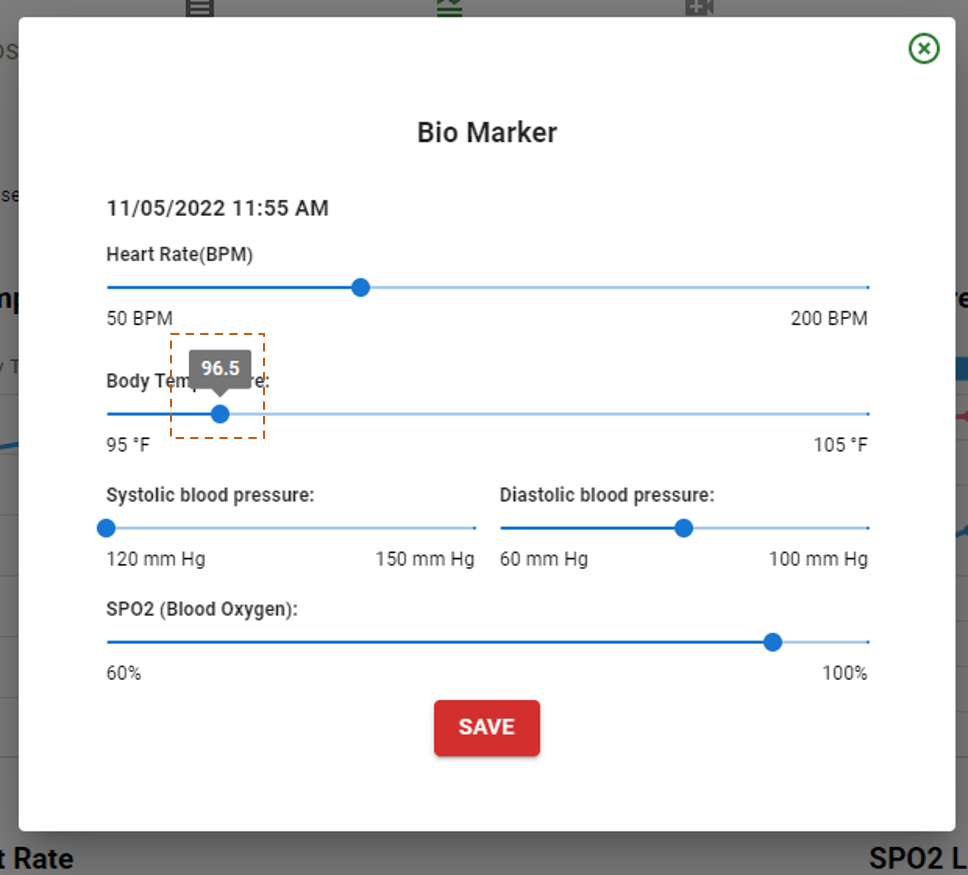 icon to open Health Monitor Tracker interface. Using different sliders in the tracker you can record your current Bio-Markers. For example, if your current body temperature (measured by standard thermometer) is 96.5 * F, you can slide Body Temperature slider to 96.5 temperature and then click on “Save”. This will create a record for current point in time with your body temperature. Over time as you keep recording your health parameters, it will create a trend, which can help doctor to make a better diagnosis for you.