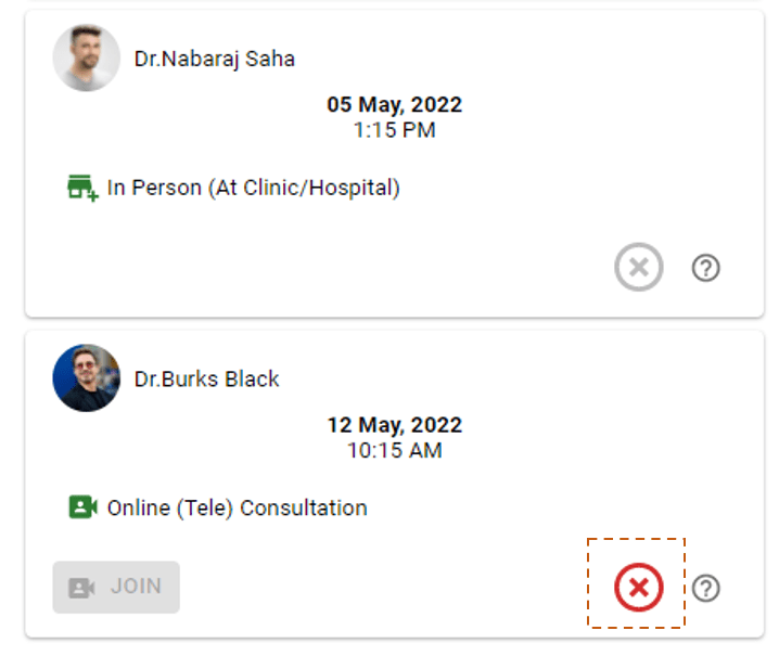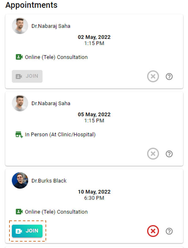 You can join video call by clicking “Join” button on the appointment card at the appointment scheduled time only. Join button will be active only for the Online appointments on the current date.