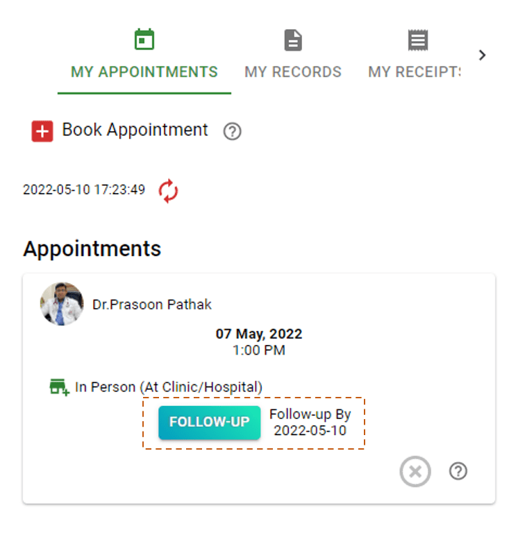 If Doctor has allowed a Follow-up, one Follow-up appointment can be booked against the current confirmed appointment for No Charge. In case Doctor has allowed follow up, s/he would enable this in Doctor’s Portal and you would see “Follow-Up” button in your appointment card like below. Please note follow-up appointment can be booked till the “Follow-up By” date.