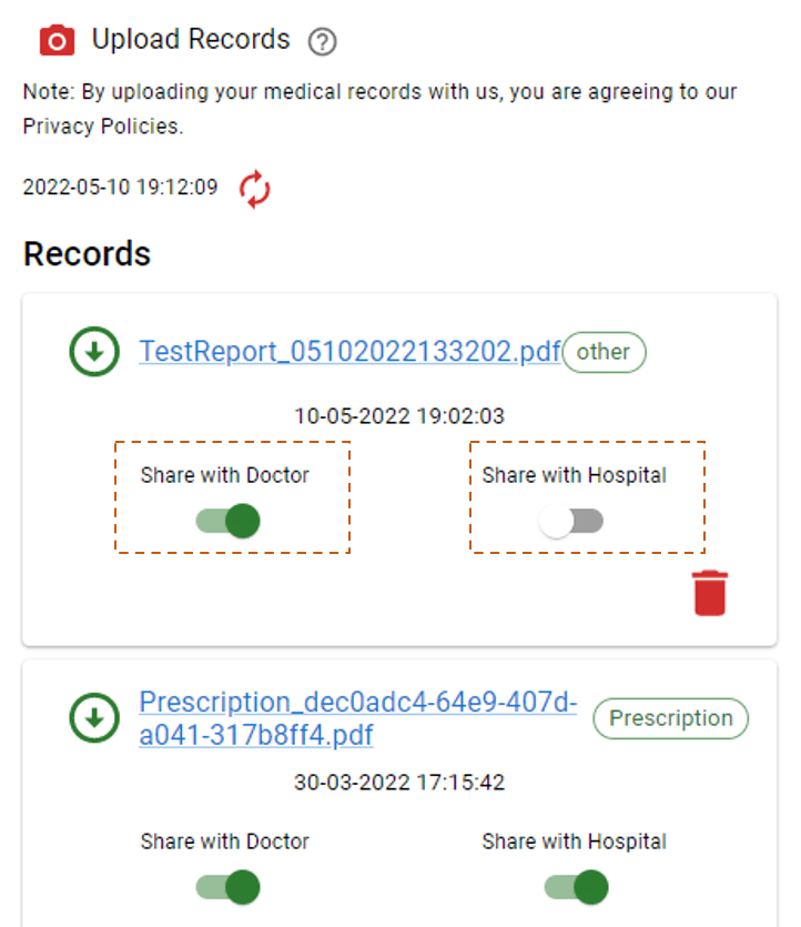 You can chose to share your medical records with Doctor or Hospital using “Share with Doctor” and “Share with Hospital” switches. If you switch off these access for any of the medical records, your doctor or hospital will not be able to access the respective file.